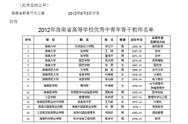 (组织人事处 报道)9月4日,根据《海南省教育厅关于公布2012年高等学校优秀中青年骨干教师名单的通知》(琼教高〔2012〕133号),我院信息技术系王凡帆老师被评为2012年海南省高等学校优秀中青年骨干教师。