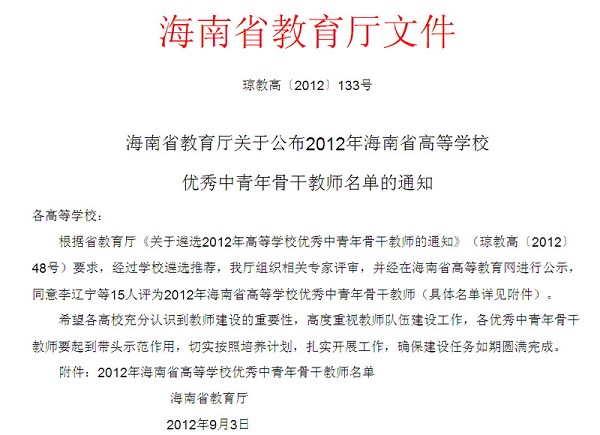 喜讯:我院王凡帆老师被评为2012年海南省高等学校优秀中青年骨干教师