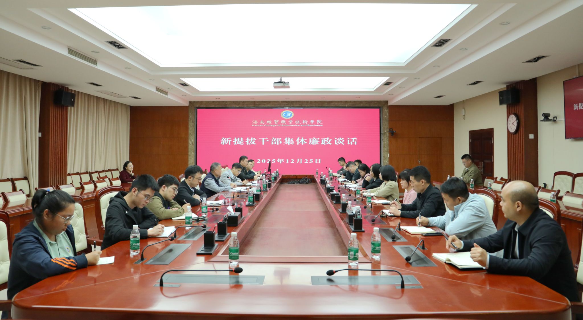 2025年12月25日,太阳集团tyc5997召开新提拔干部集体廉政谈话会议,学校党委委员、纪委书记、监察专员符史杭,党委委员田小林出席会议。23名新提拔干部参加会议。